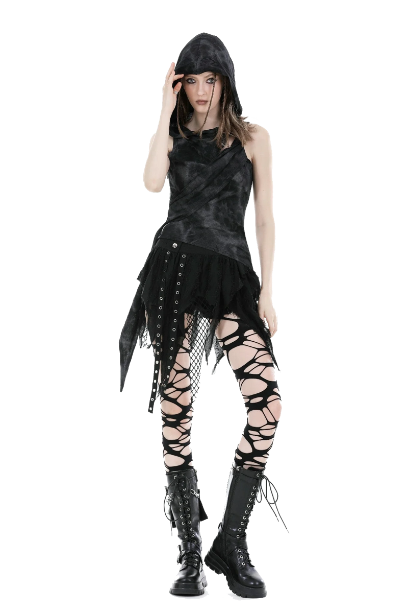 Women's Post-Apocalyptic black mini skirt., hanky hem with raw edges, eyelet strap detail, distressed fabric and wide knit mesh, button closure