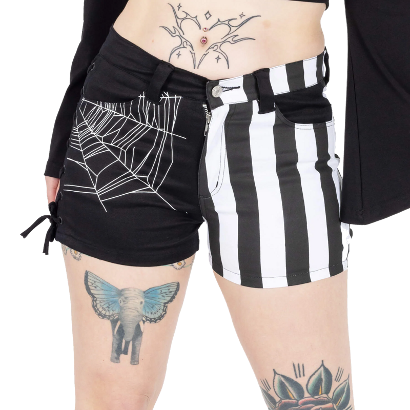 Black and white ladies shorts with a spider web pattern printed on the black side. On this side there's also a lace.The other half part is striped. Pockets on both sides and in the back.
