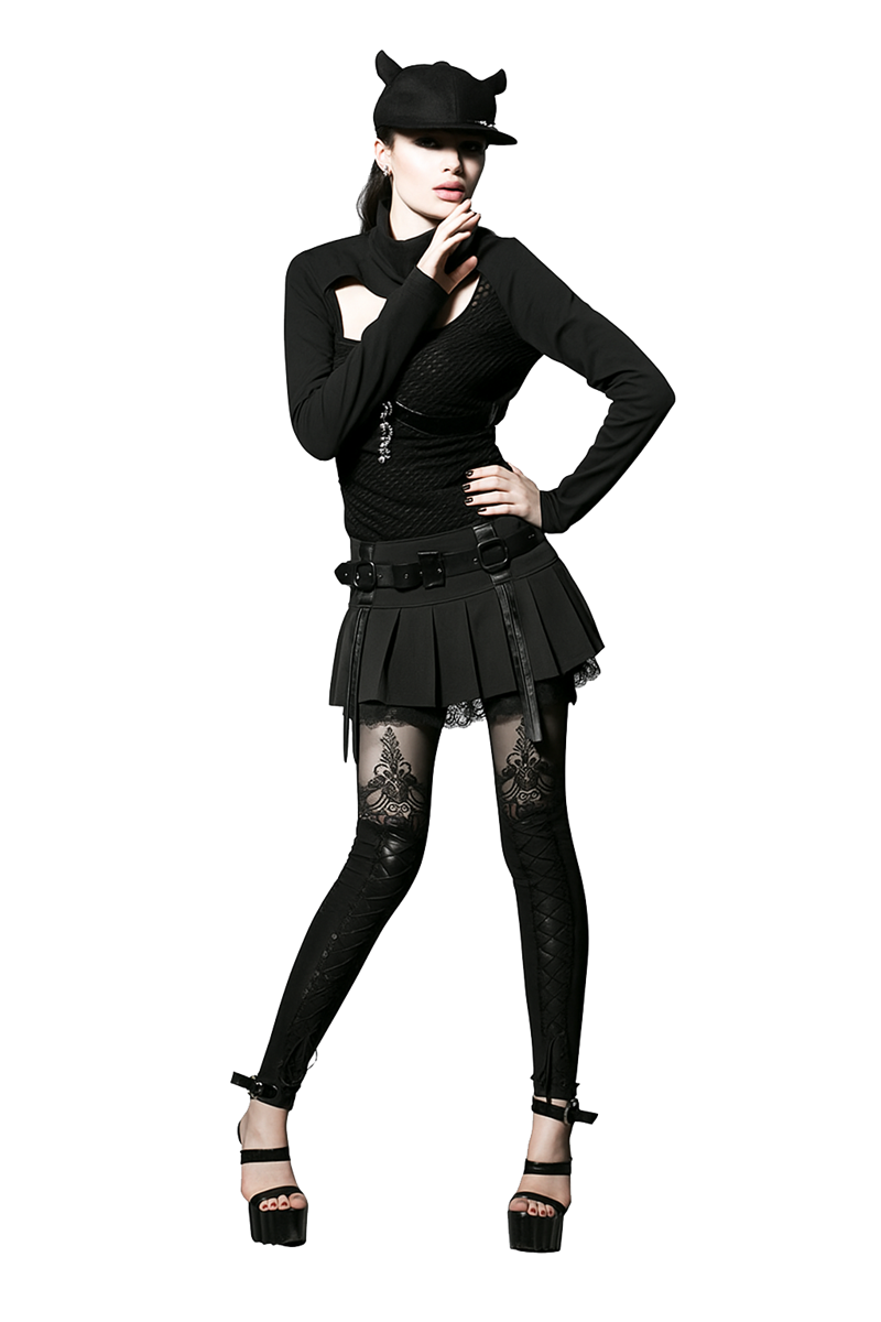 Womens Baroque Gothic leggings. Turn heads in these striking black wetlook leggings, embossed with a subtle paisley pattern and detailed with side braiding. Sheer lace thigh panels and corset-style ribbon lacing bring dark elegance with a rebellious twist.