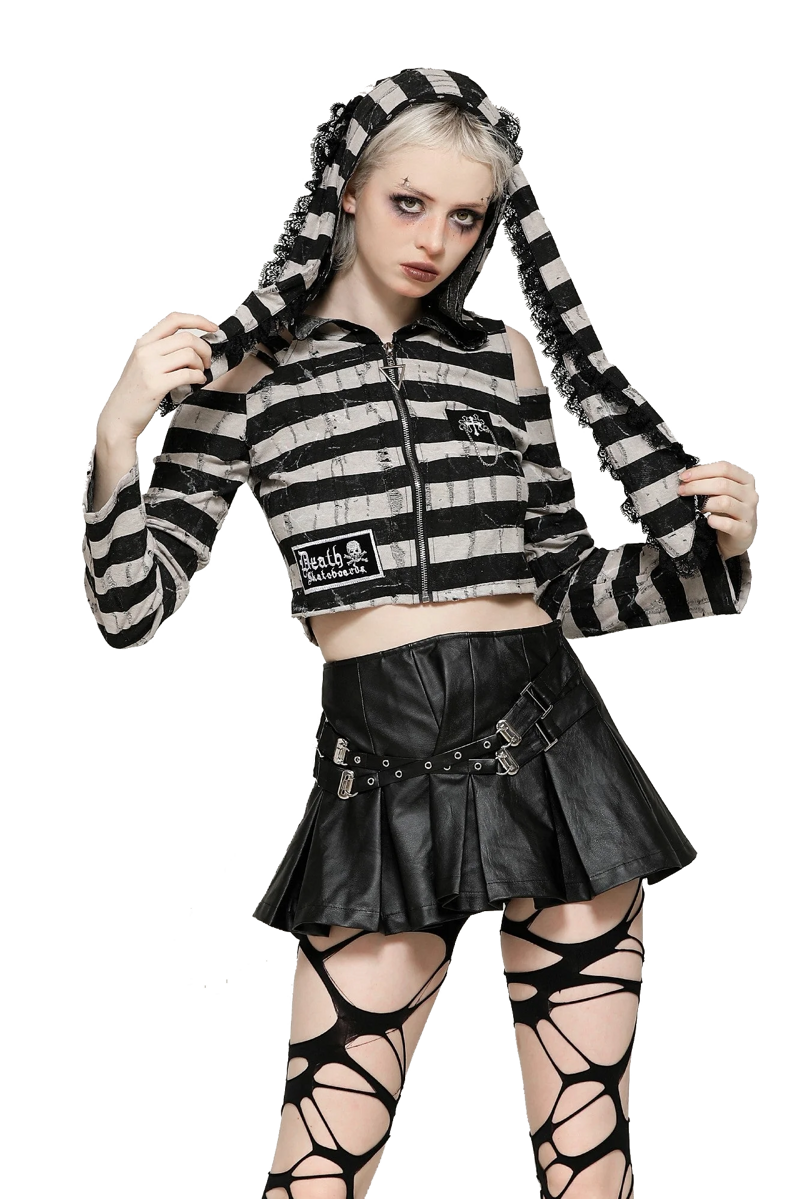Stand out with this bold striped gothic crop hoodie, a perfect fusion of dark alternative fashion and playful rebellious attitude. Designed for those who embrace unique statement pieces, this top combines distressed aesthetics with eye-catching silhouette details.